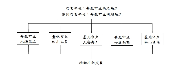 本組召集學校由臺北市立南港高級工業職業學校擔任,臺北市立內湖高級工業職業學校為協同召集學校,推動小組成員包括實習處主任、實習輔導組組長及建教合作組組長等相關人員,共同推動實習工作組各項計畫與商討困難解決策略。組織架構如下: